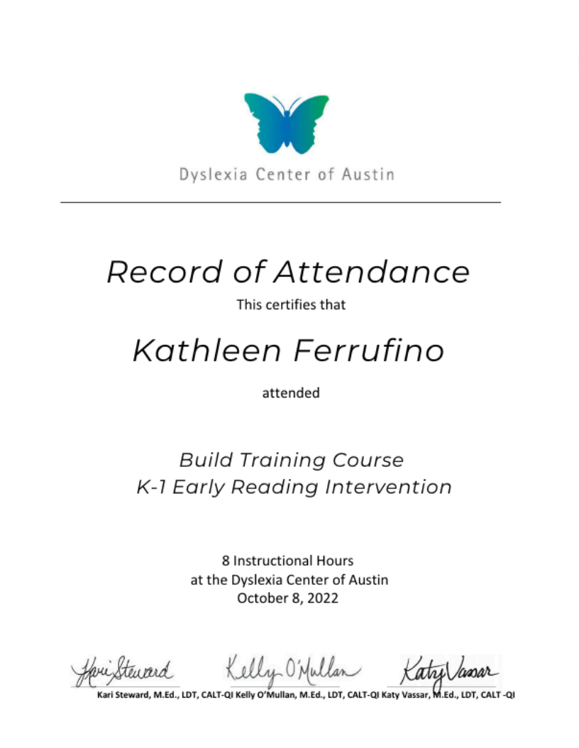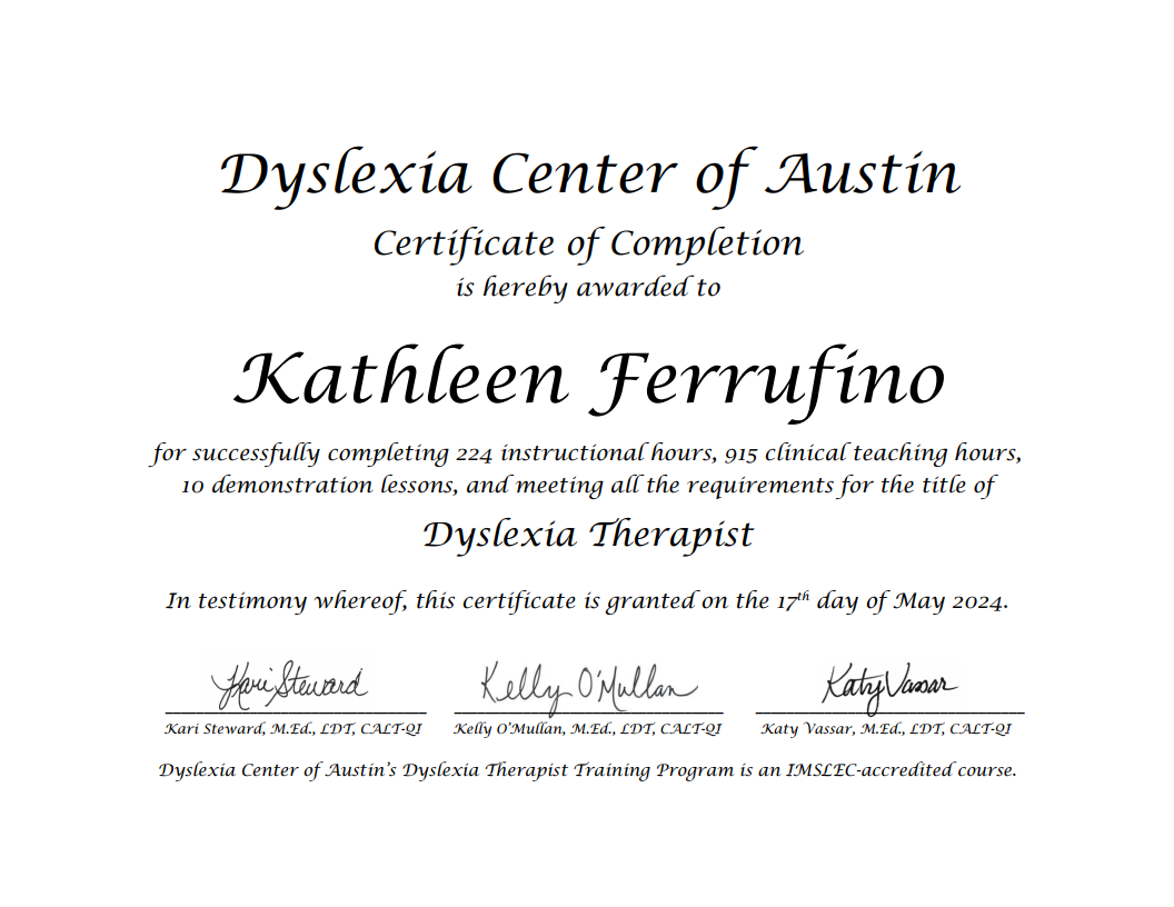 As a dyslexic individual, I know firsthand the struggles of reading, writing, and spelling. In first grade, I felt like a failure as the letters didn’t make sense to me, and my teachers were unable to help. It wasn't until third grade, when I started working with an Orton-Gillingham certified tutor, that I finally learned to read using a direct, systematic, and multi-sensory approach.